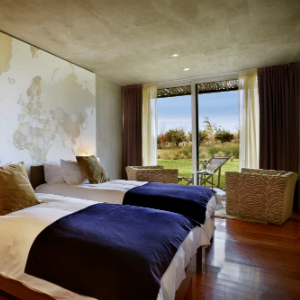 Perched along the El Chaltén Valley and surrounded by mountains, this chalet-like property offers five-star services, cheerful interiors, and luxurious amenities, including a gourmet restaurant, gym, pool, and spa.