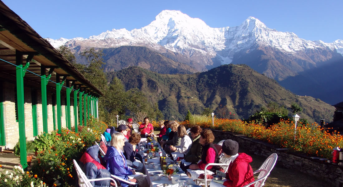This simple lodge is perched on a ridge overlooking the beautiful Phedi and Mardi Valleys and the span of the Annapurna range to the north. The property features 8 rooms with ensuite baths, providing a comfortable respite after trekking. From the lodge you may explore the old village of Dhampus, or simply relax and soak in the tranquility of its location.