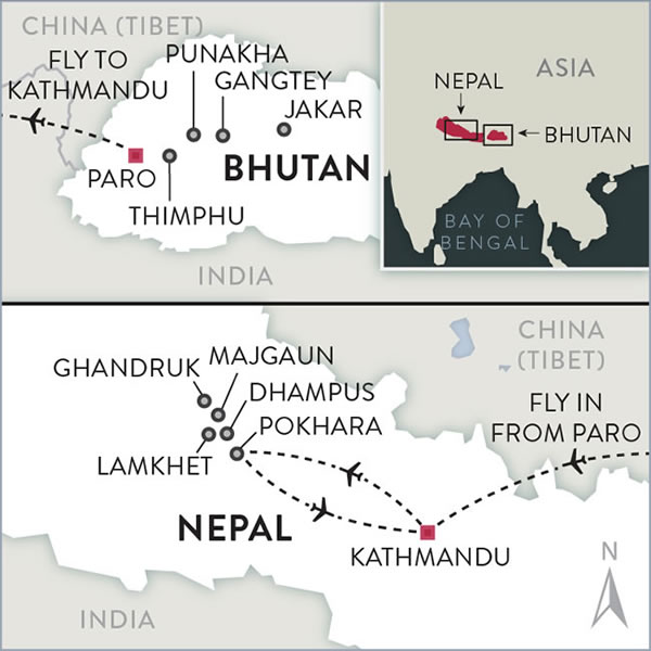 Day 1: Arrival in Paro; transfer to Thimphu and city exploration by footDay 2: Hike to Cheri Goemba; Choki School of ArtsDay 3: Transfer to Punakha; walk to Temple of the Divine Madman Day 4: Khamsung Yuely Namgyel Temple to Punakha Dzong hikeDay 5: Transfer to Paro; visits to Bhutan's National Museum, Paro Dzong & Kyichu LhakangDay 6: Tiger's Nest Monastery hike Day 7: Fly from Paro, Bhutan to Pokhara, Nepal (via Kathmandu)Day 8: Pokara to Lamkhet hike Day 9: Lamkhet to Ghandruk hike Day 10: Ghandruk to Landruk hike Day 11: Landruk to Dhampus hike Day 12: Dhampus to Pokhara hike Day 13: Departure from Kathmandu; Mount Everest flight (optional)