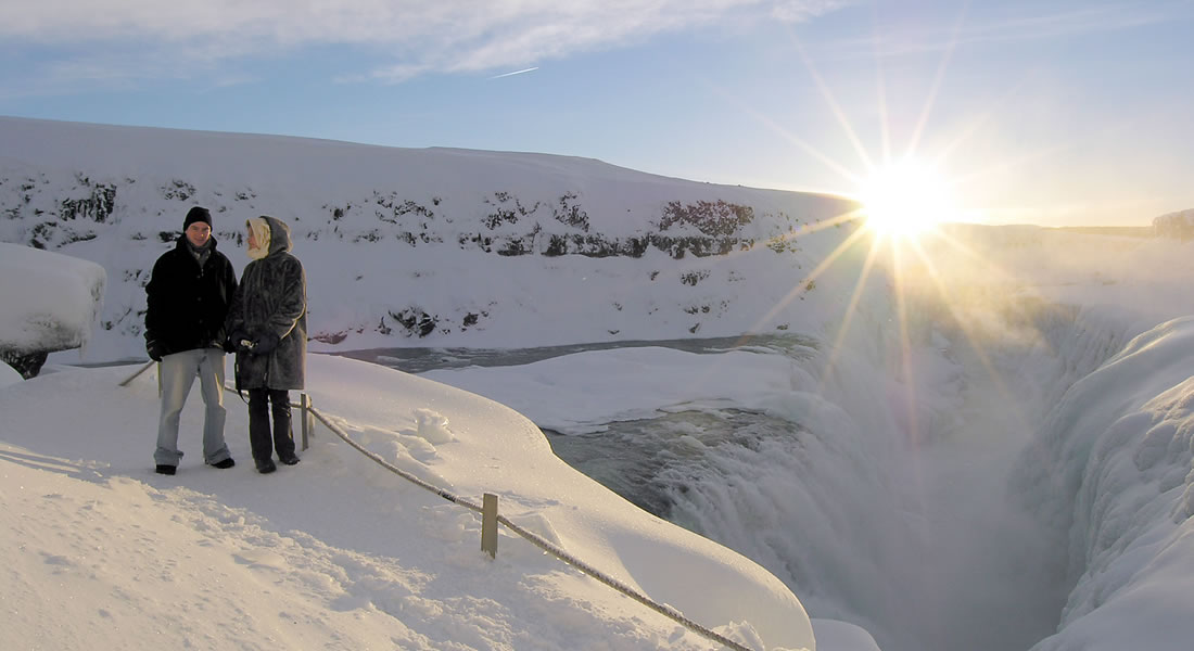 Our exploration of Iceland's magnificent landscape continues with a visit to the impressive Gullfoss Waterfall, a spectacular sight in winter surrounded by snow and hanging sheets of ice. The sheer power of the earth emanates from the cascading water. Only a few minutes away is one of the most active geysers in the area, Strokkur, which shoots up almost 100 feet into the air every few minutes.