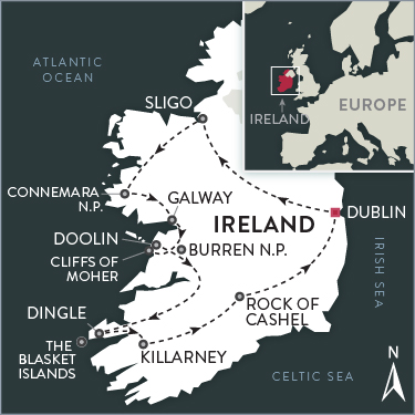 In the evenings, there is time to savor local music (perhaps even enjoy a bit of dancing!), indulge in excellent fresh seafood, lamb and other local specialties. Stroll through the colorful towns of Galway, Dingle and Killarney, and enjoy glorious sunsets and mighty craic throughout the journey.