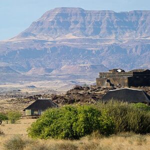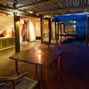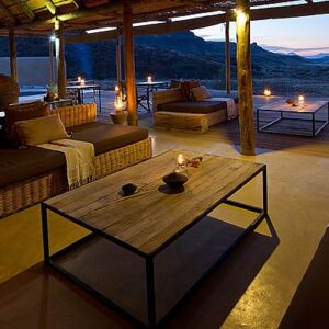 This camp is located in heart of the rocky desert of Damaraland, an ancient, starkly beautiful landscape. It comprises of 5 semi-permanent dome tents on wooded platforms, each with a small viewing deck. Inside, guests find comfortable mattresses, plush bedding, and an open-air, ensuite bathroom complete with flush toilet and hot and cold running water. Tucked away amongst the sandstone hills, Damaraland offers endless vistas and one of the best wilderness areas in Namibia.
