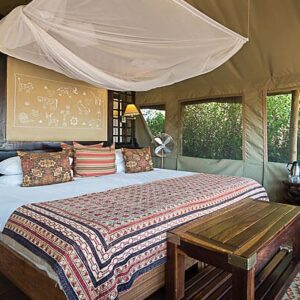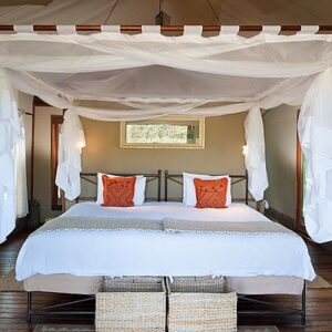 Ongava Tented Camp is situated along the southern boundary of Etosha National Park in a secluded area within the stunning landscape of private Ongava Game Reserve, and accommodates just 16 guests in eight spacious tents constructed from local stone, canvas and thatch, each featuring ensuite facilities and private verandas. The main area features a relaxing bar and swimming pool, all overlooking the active waterhole. Activities include game drives, hide visits, nature walks, and rhino tracking.