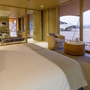 Located near the spectacular sights of Sossusvlei, the camp comprises of 5 semi-permanent dome tents on wooden platforms, each with a mini veranda. Inside, guests find comfortable mattresses, plush bedding, and an open-air, ensuite bathroom complete with flush toilet and hot and cold running water. Enjoy views into the Namib Naukluft National Park, dining under the star-filled Namibian skies, and watching rose-red sunsets. The Sossusvlei dunes are accessed through the camp’s private gate, which is conveniently located right at the entrance to the dune corridor.