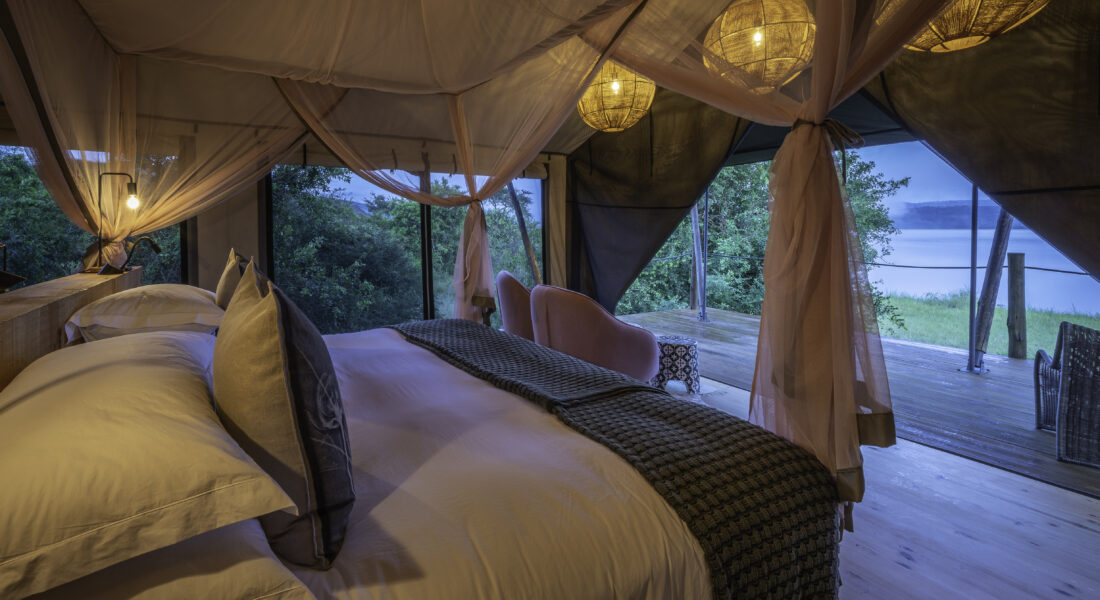 Located in the only private access area in Akagera, Magashi Camp is situated in the productive and phenomenally diverse northeastern corner of Akagera National Park. Six spacious and airy tented guest rooms offer uninterrupted views over Lake Rwanyakazinga, while Magashi’s main area comprises a luxurious lounge, dining and bar area, wine cellar, and pool, as well as an expansive viewing deck with convivial fire pit. Fittingly, the architecture and interiors pay homage to traditional Rwandan culture.
