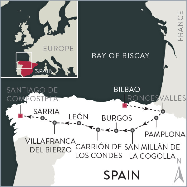 Your tour of Spain begins in Bilbao before transferring to southern France, where we join the Camino in Saint-Jean-Pied-de-Port. From here, we walk and hike along the French Way, on sections of the Camino that highlight the most scenic mountains, hills, and plains of northern Spain to Santiago and on to Finisterre — or Land’s End — on the Atlantic Ocean. As we advance westwards across the Iberian peninsula, we follow in the footsteps of millions who have gone before us, visiting monuments and churches that have borne witness to the passage of multitudes. Along the way, we enjoy the company of other pilgrims sharing a common endeavour, and have the opportunity to reflect on the significance of the Camino’s history and our own exterior and interior journeys.